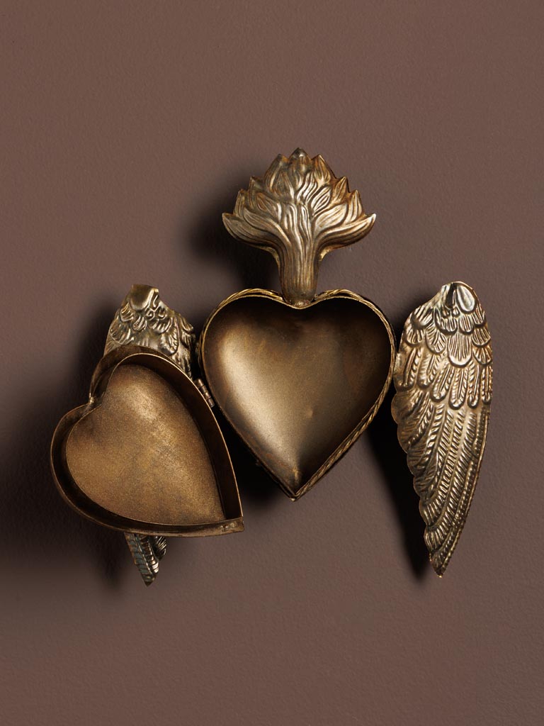 Cette boîte ex-voto en métal, ornée de délicates ailes, évoque la protection, la liberté et la symbolique du cœur sacré.