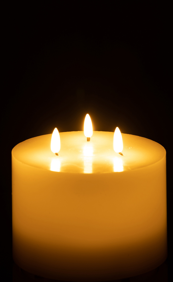 Cette bougie LED à 3 flammes est une bougie décorative réaliste équipée de trois lumières vacillantes imitant la flamme naturelle.