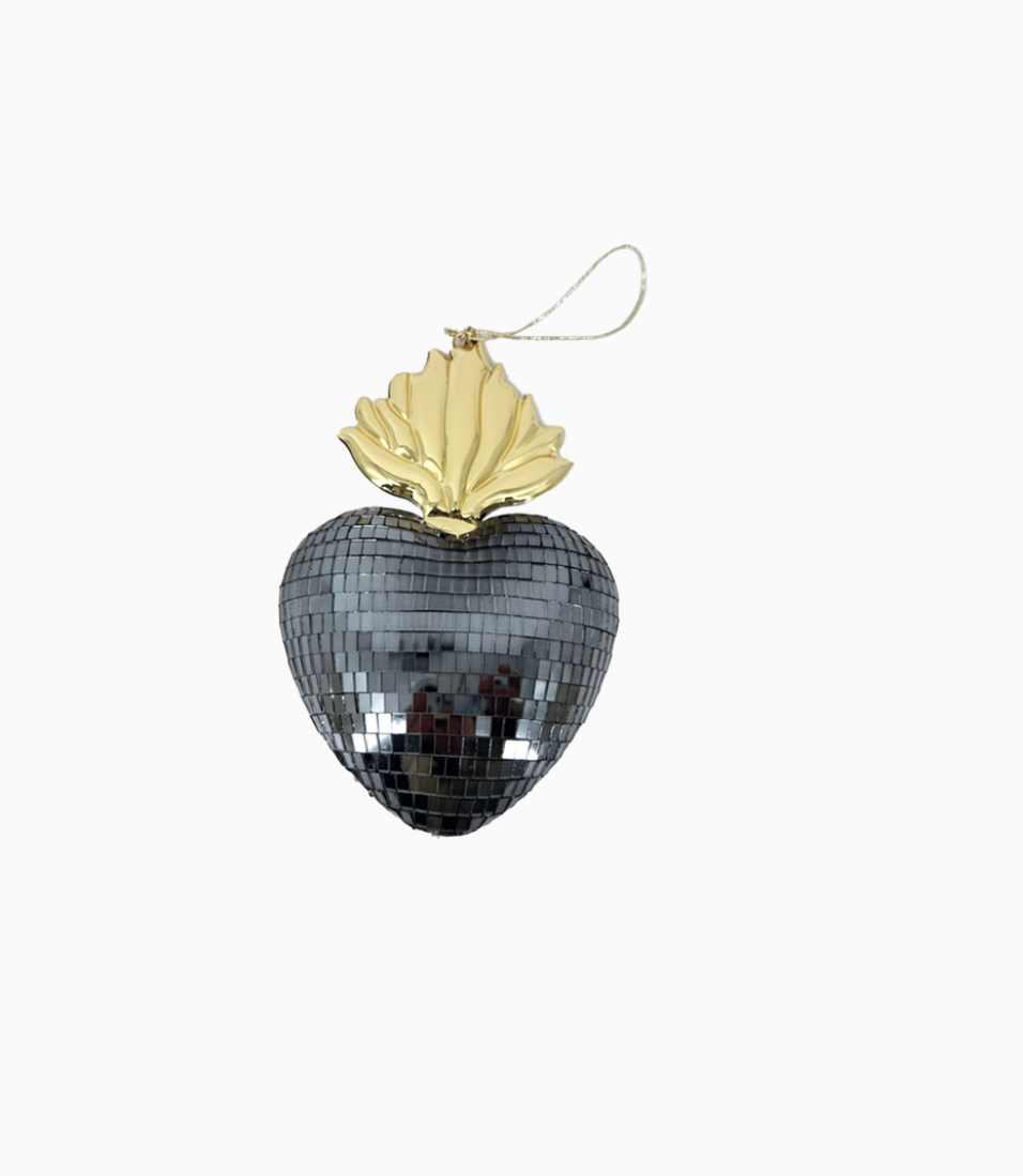 Cette boule à facettes en forme de cœur mêle éclats dorés et noir pour un effet scintillant et glamour.