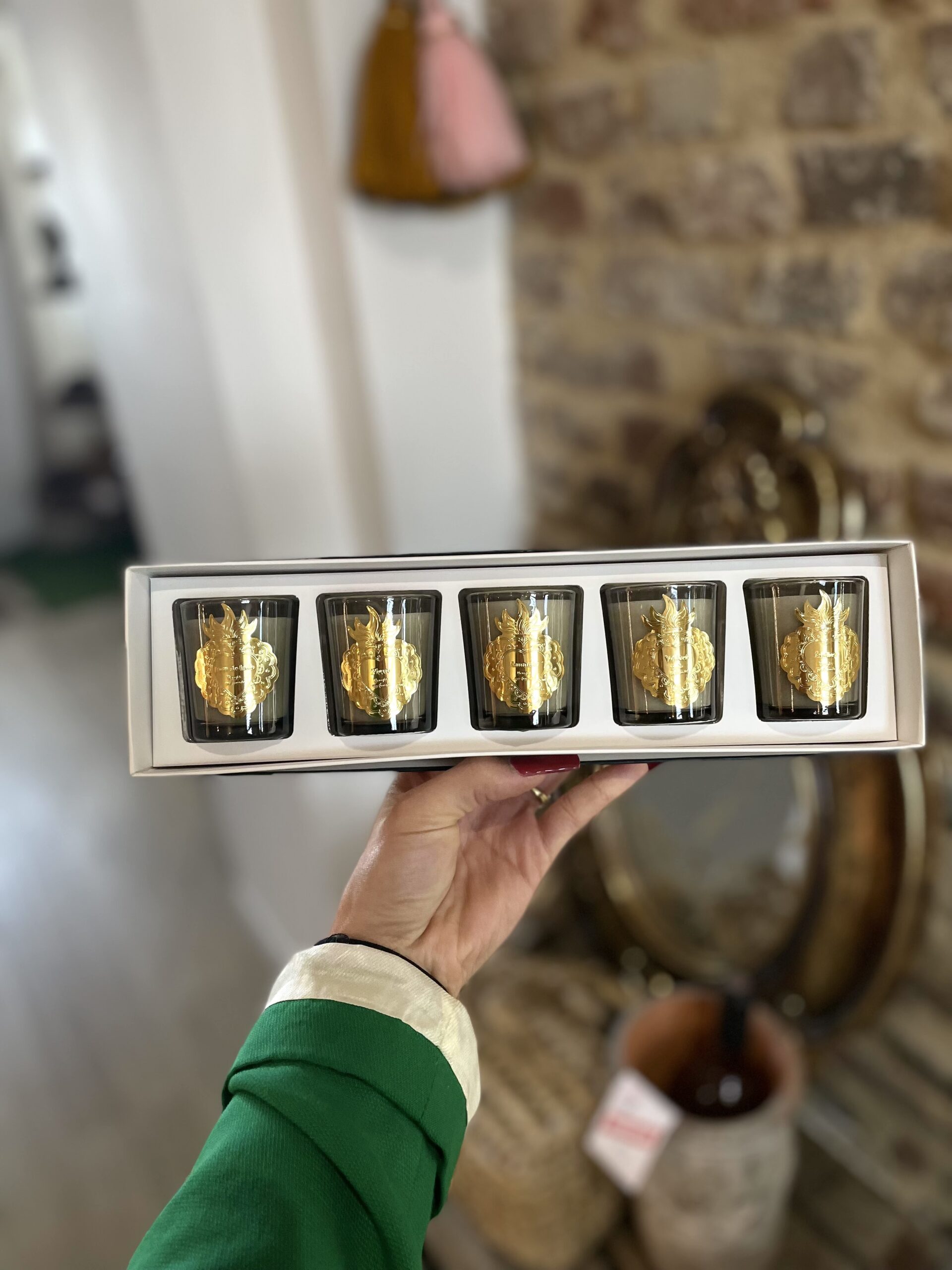 - 5 minis bougies ( 30g chacune ) : bergamote, feu de bois, figue, amande, ambre