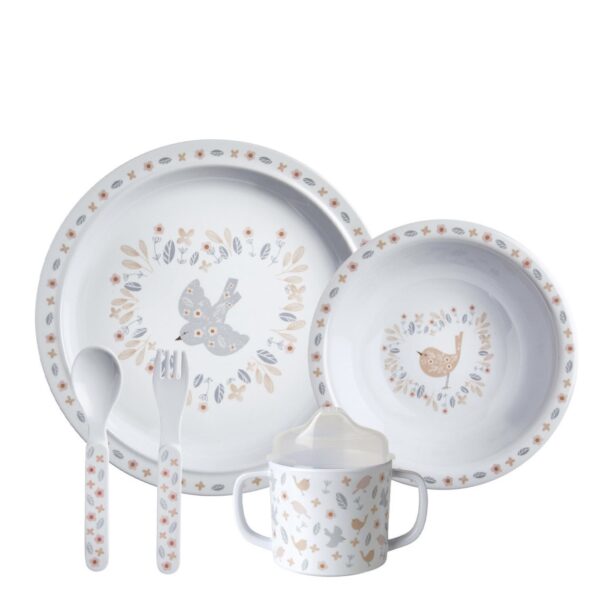 Un coffret bébé repas Mathilde M, composé d’accessoires délicatement décorés.