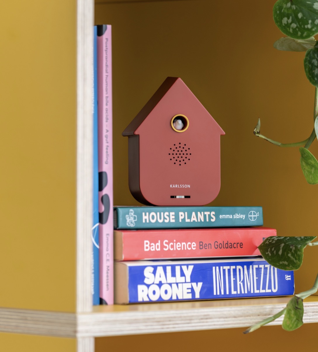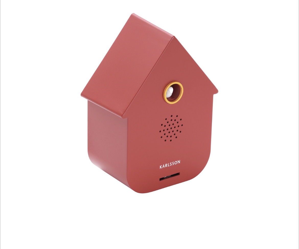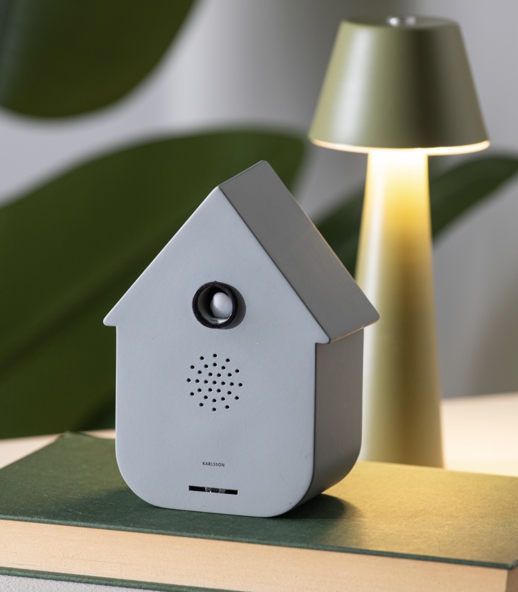 Un détecteur de présence design orné d’un oiseau coucou décoratif sur le dessus, alliant fonctionnalité et style.