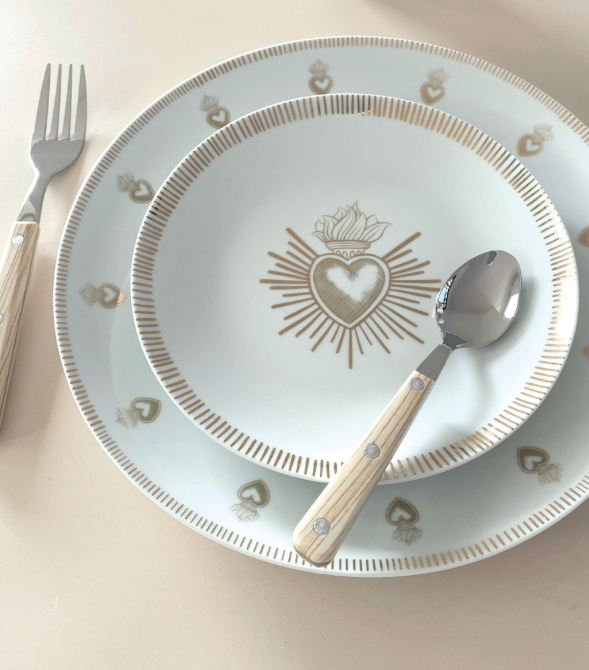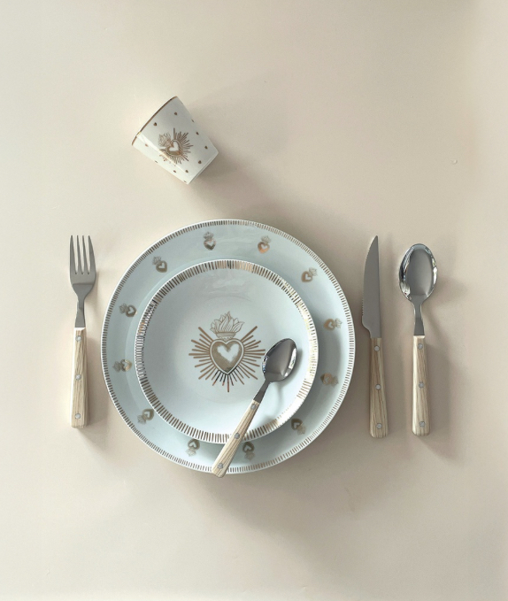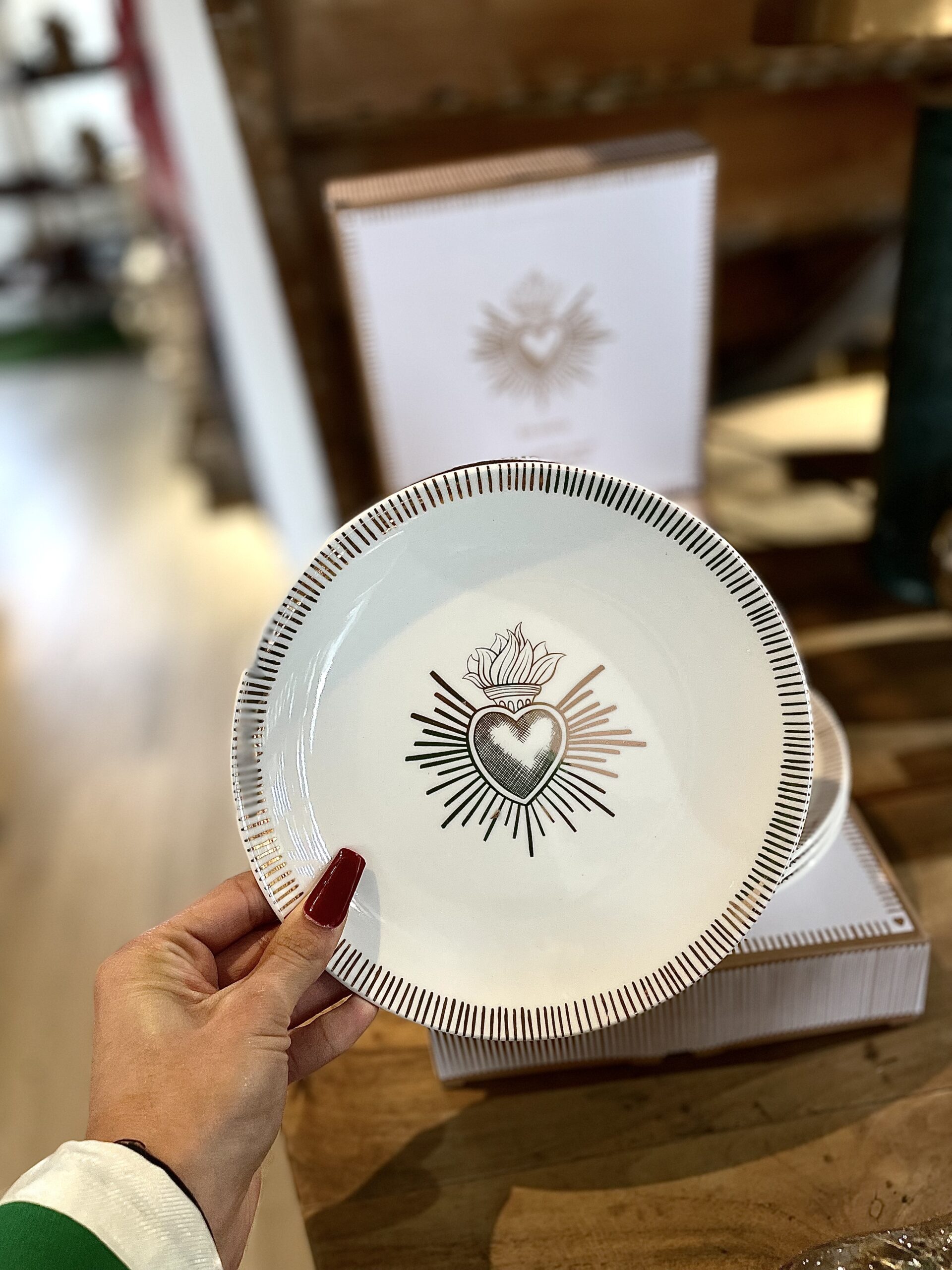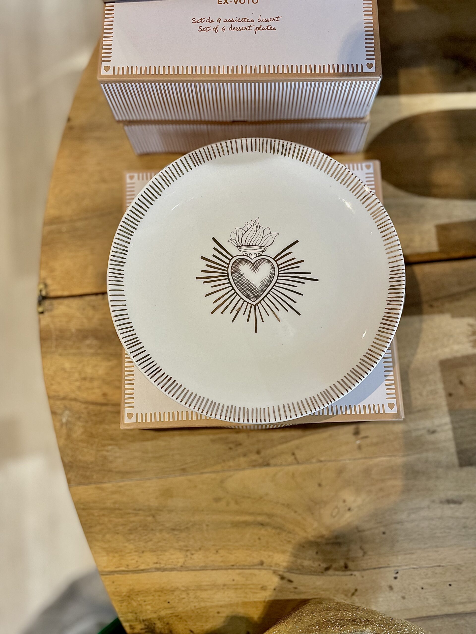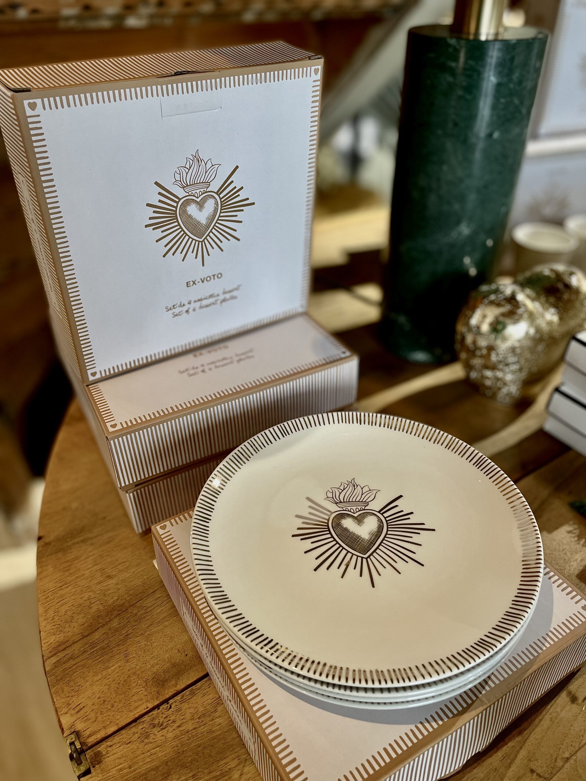 Ce lot de 4 assiettes ex-voto en céramique blanche est sublimé par de délicats motifs dorés inspirés de l’iconographie sacrée.