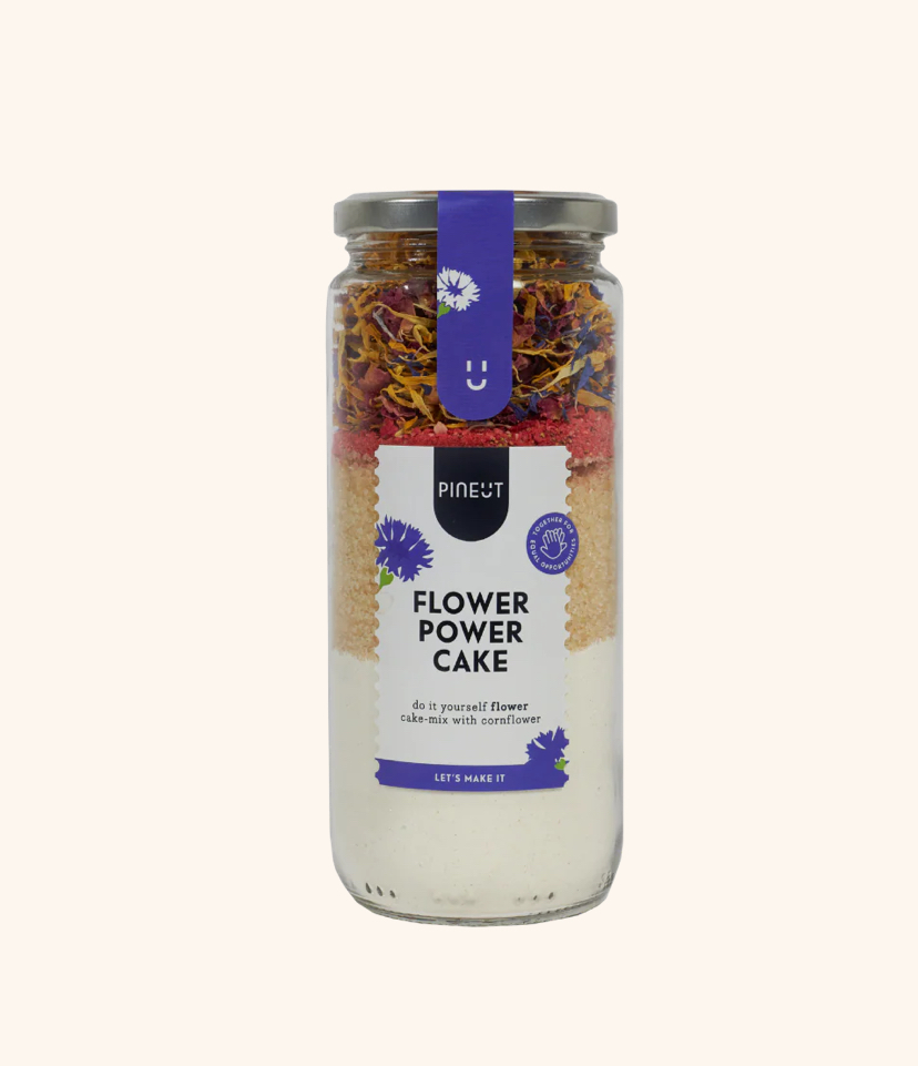 Ingrédients ; Farine fermentante, farine de blé, agents levants, sucre de canne, fraise lyophilisée, mélange de fleurs séchées (2%) ; ( calendula, pétales de roses et bleuet ).