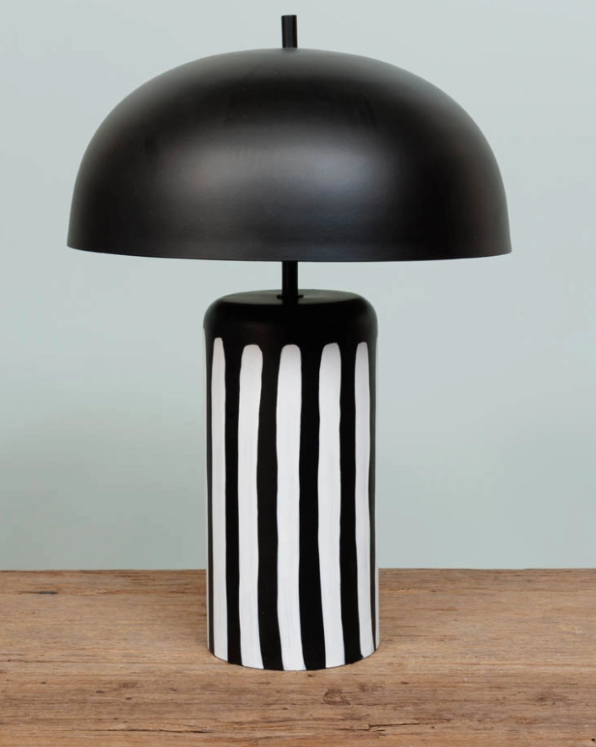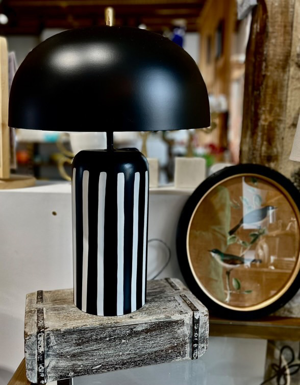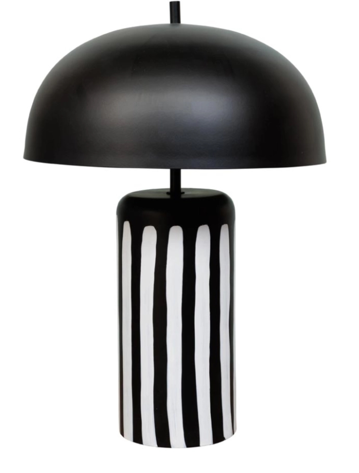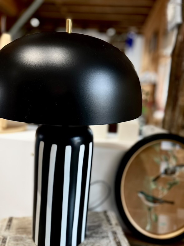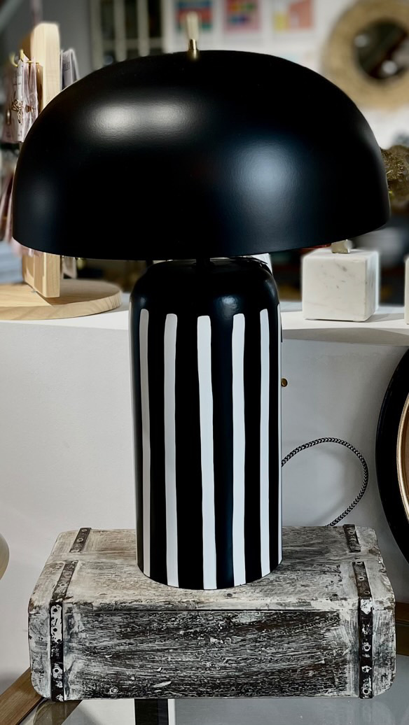 Élégante et moderne, cette lampe à poser arbore un design épuré avec un pied noir avec des rayures blanches.