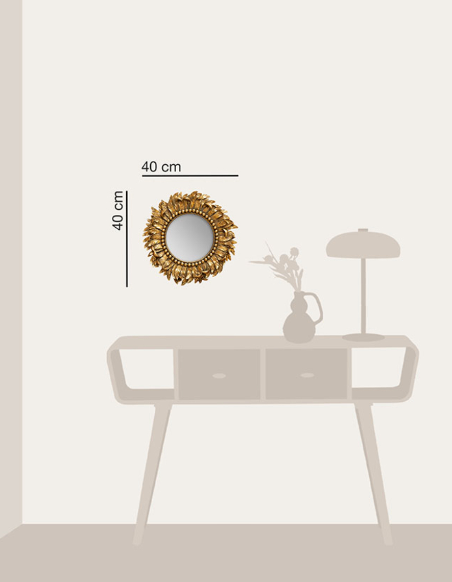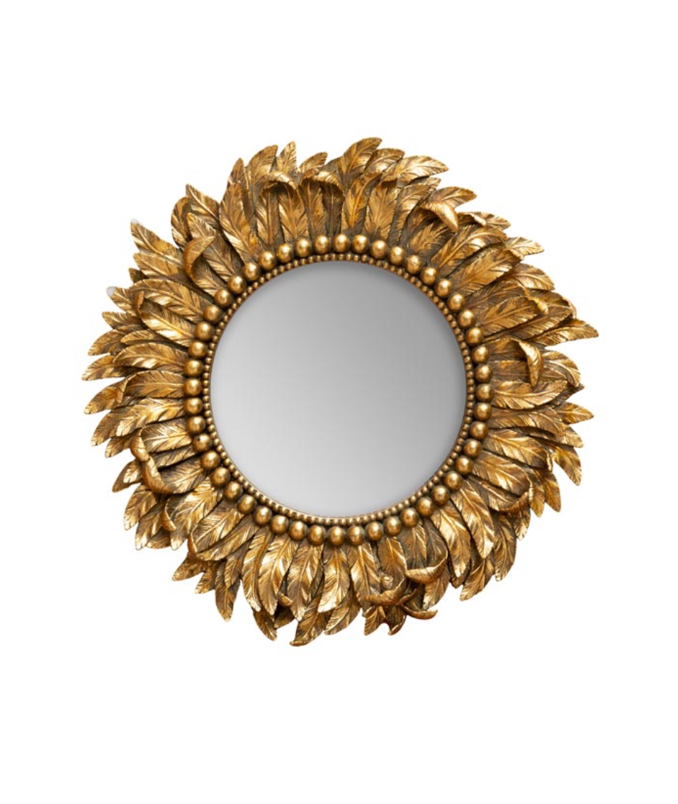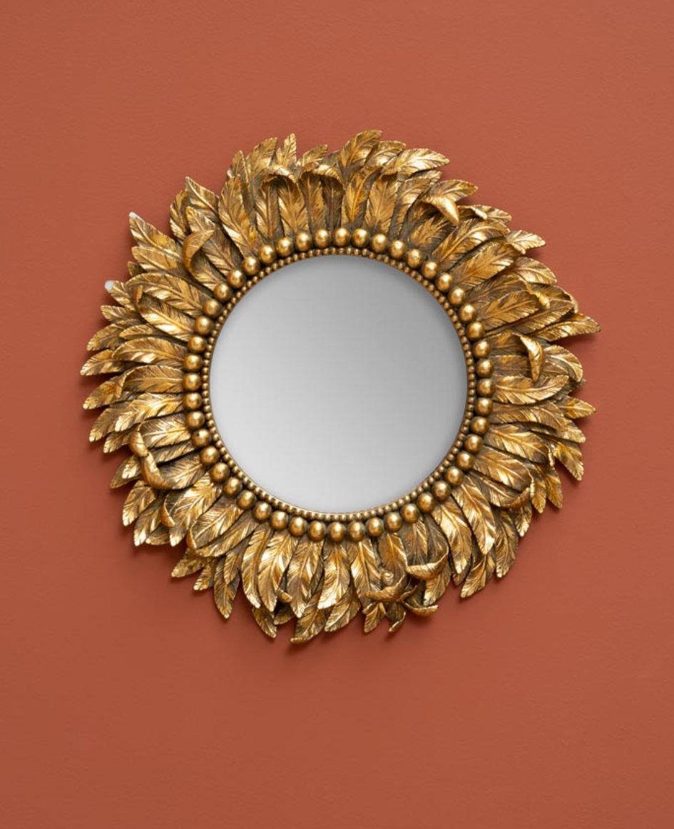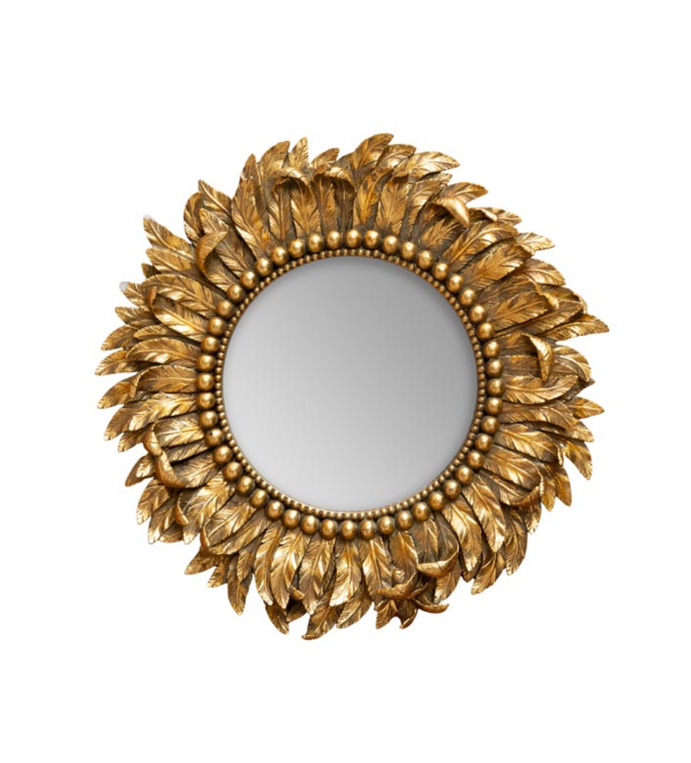 Ce miroir doré au décor de plumage délicat, il se distingue par son relief finement travaillé et son éclat lumineux.
