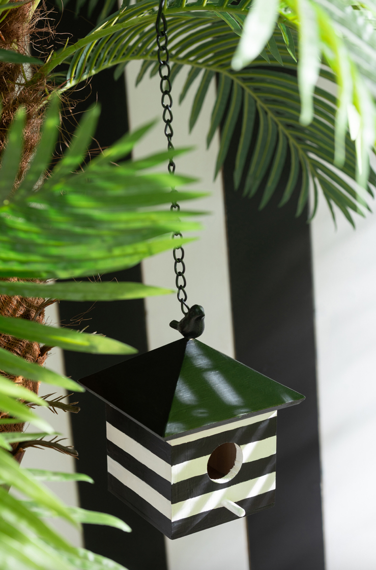 Ce nichoir en bois rayé blanc et noir, au design graphique et élégant.
