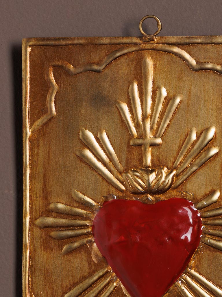 Plaque ex-voto rouge doré, symbole de passion et de dévotion.
