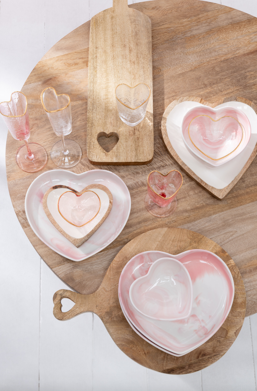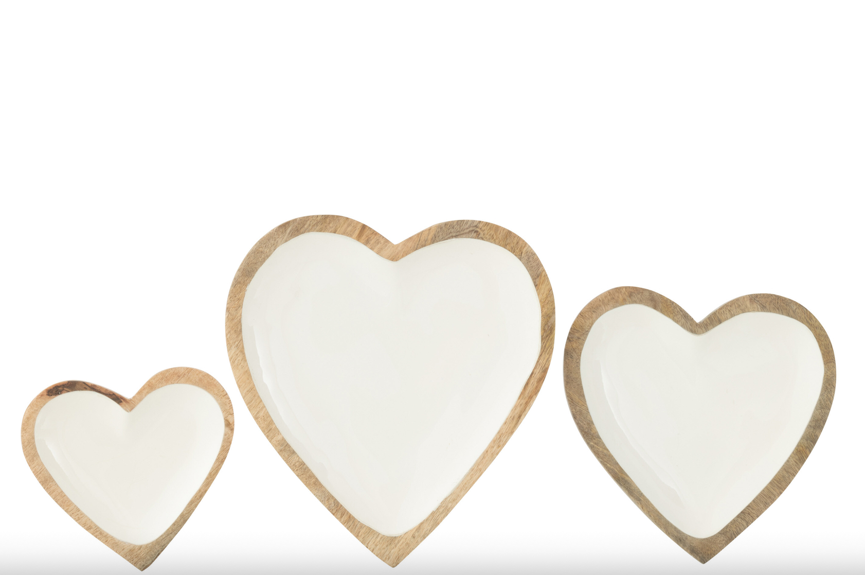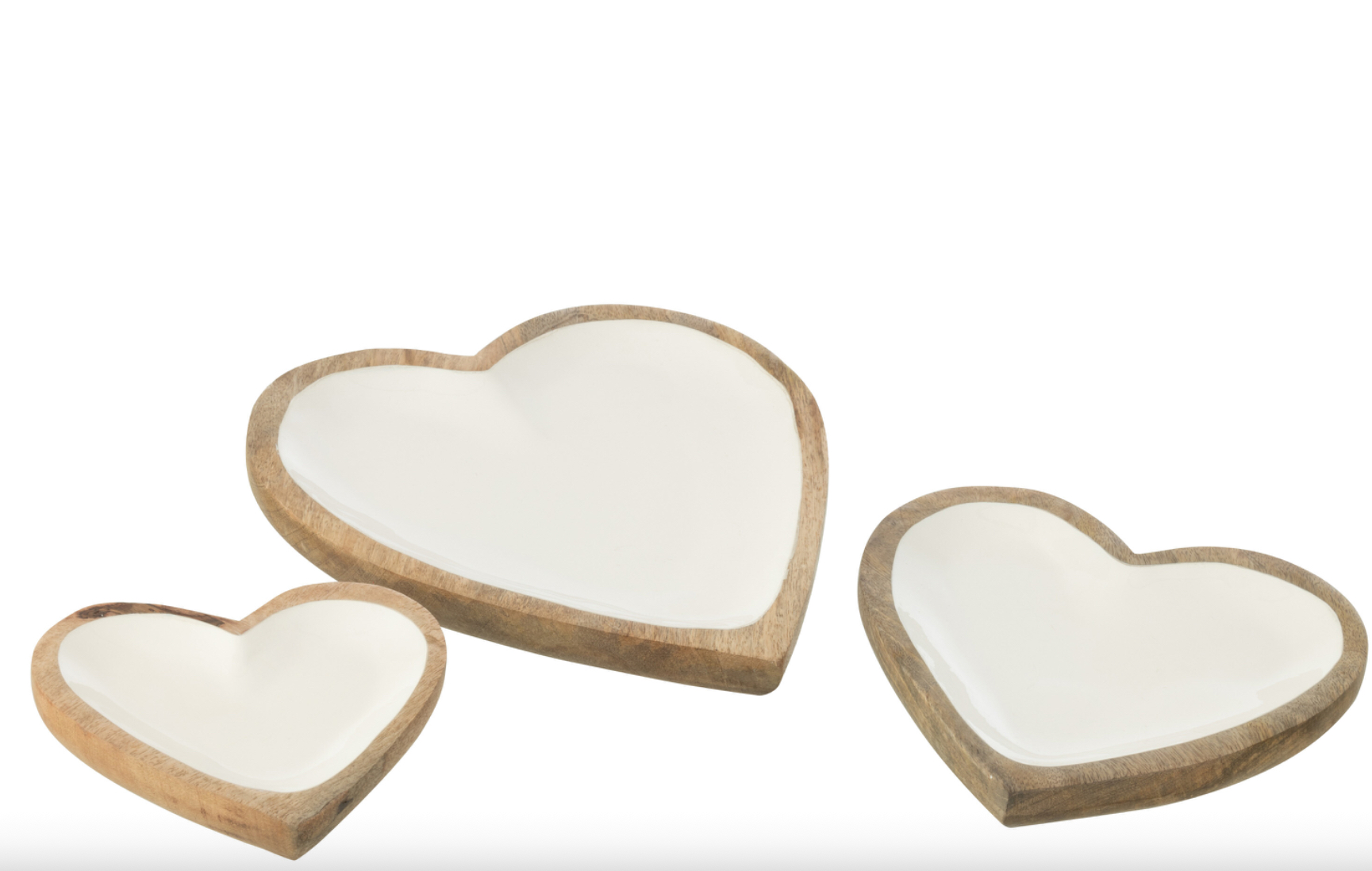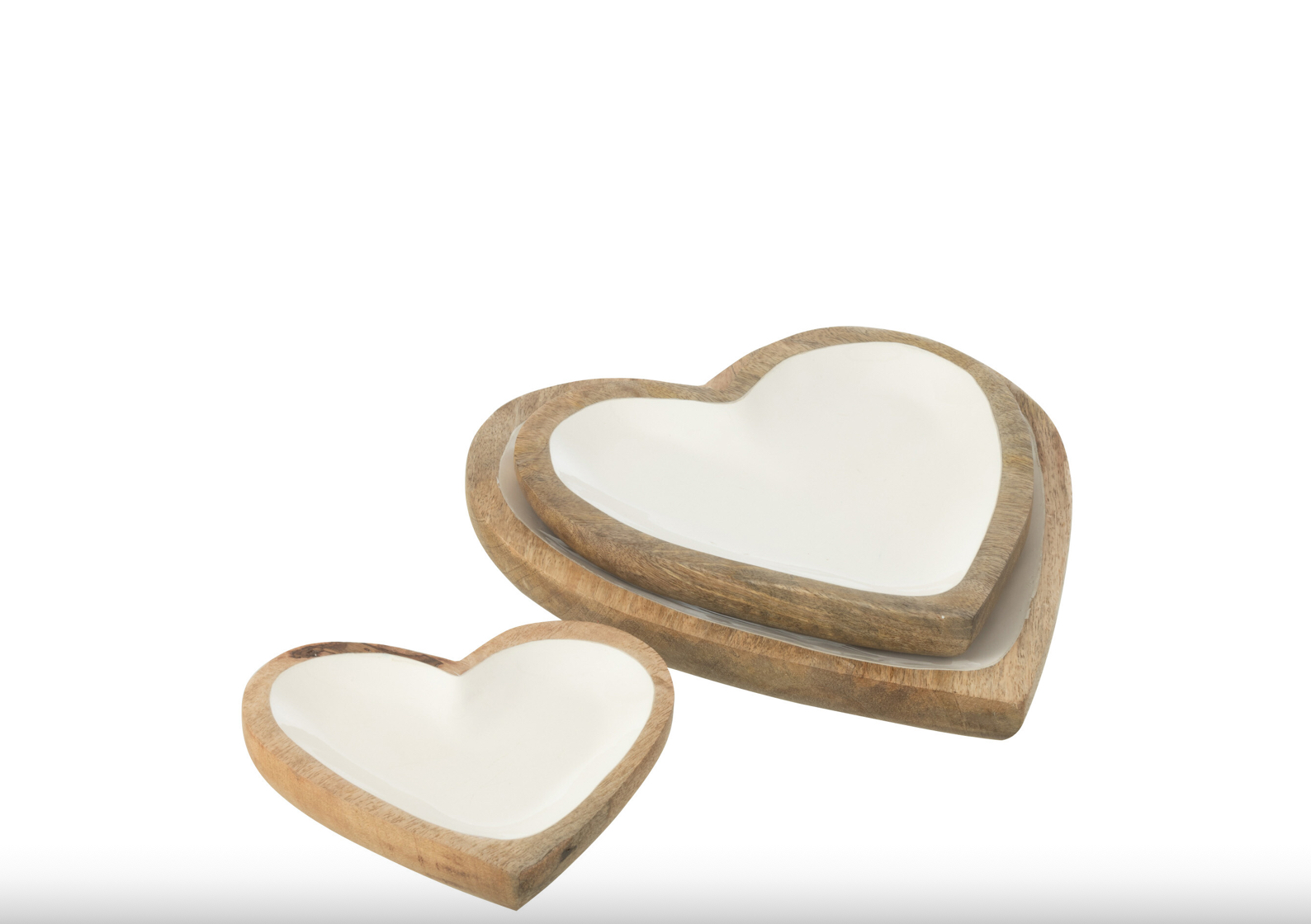 Ces trois plats en forme de cœur, déclinés en différentes tailles, mêlant harmonieusement le bois naturel et le blanc.