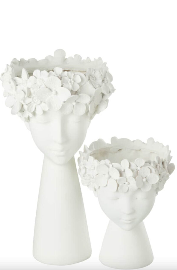 Ces pots décoratifs en forme de visage, délicatement ornés de fleurs blanches disposées tout autour.