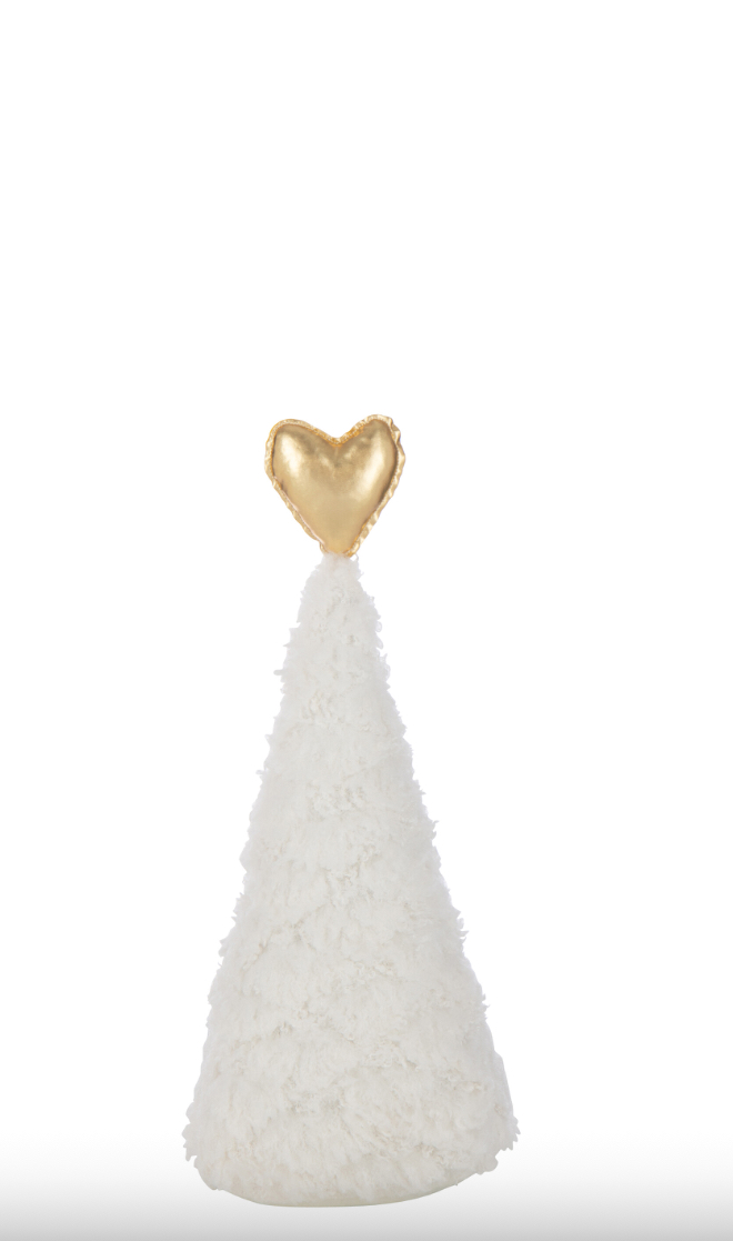 Cet élégant sapin décoratif blanc givré et lumineux, orné d’un cœur doré scintillant au sommet.