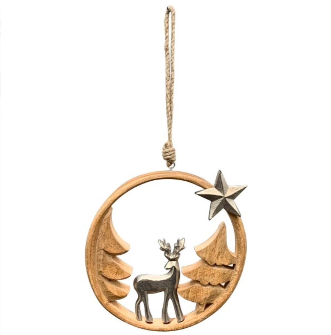Une suspension en bois en forme de cercle, abritant un adorable renne de Noël au centre.