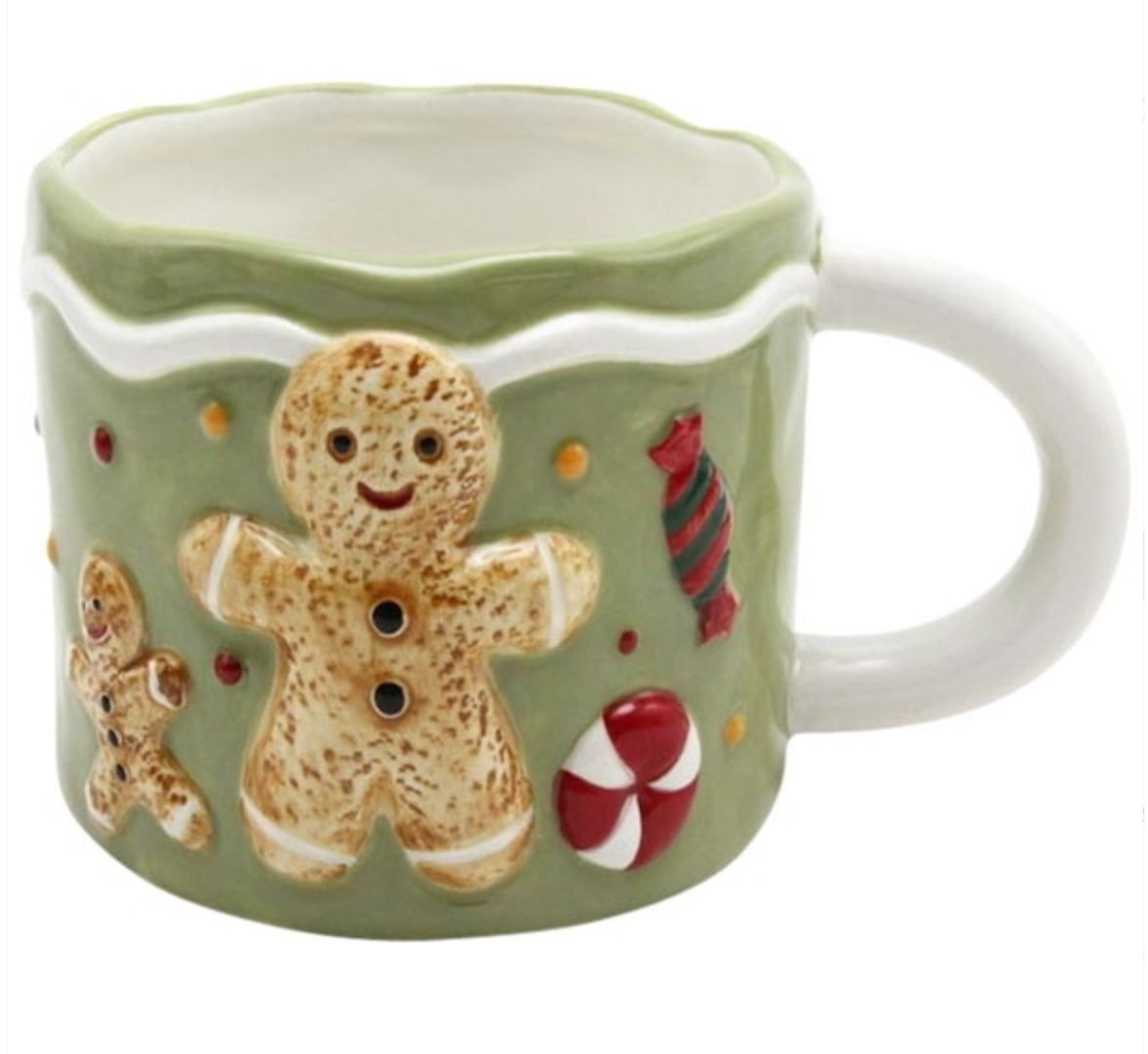 Une tasse de Noël ornée d’un petit pain d’épice, allie gourmandise et esprit festif.