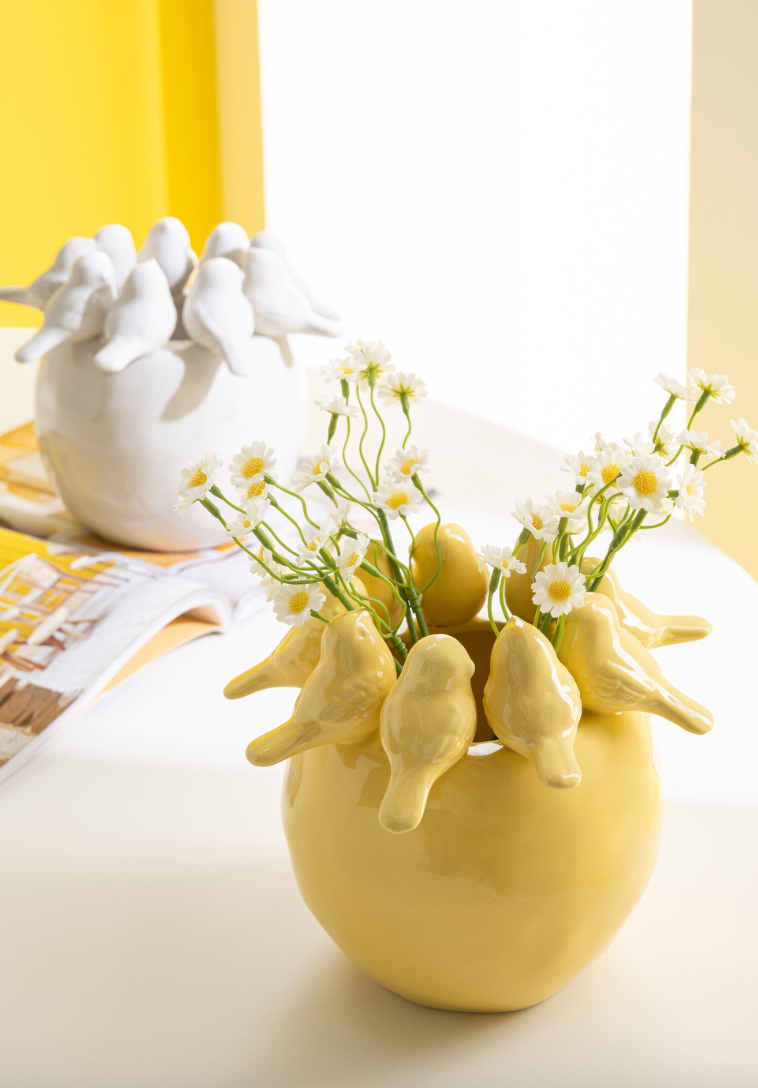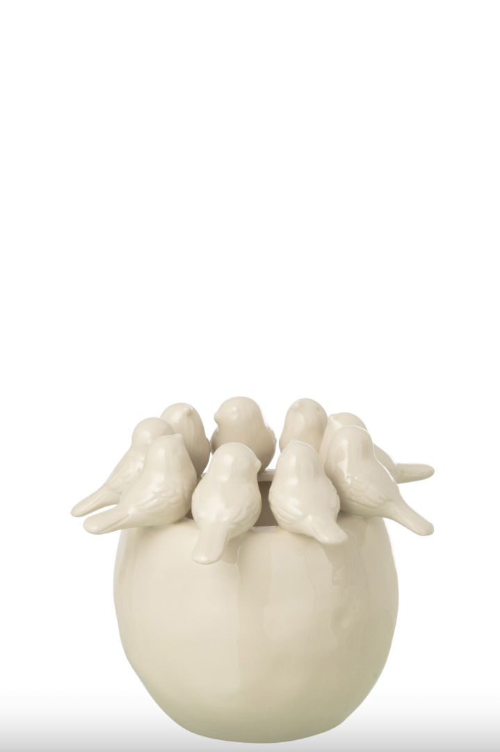 Ce vase en forme de boule, orné de nombreux oiseaux délicatement sculptés sur la partie supérieure.